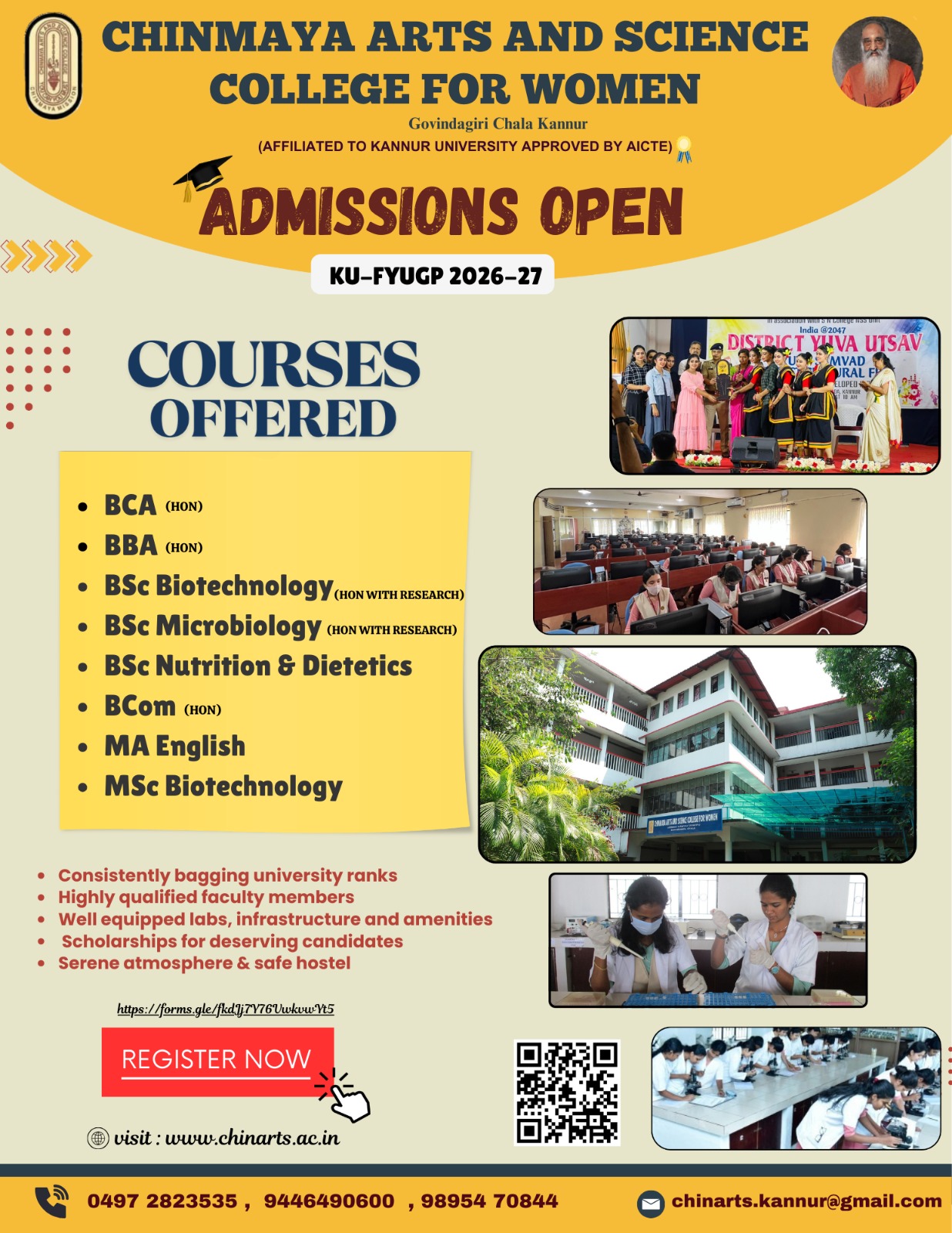 Kannur University Four Year Under Graduate Programmes (KU-FYUGP) in Affifiated Colleges was approved and implemented with effect from the academic year 2024-25. The Online Centralized Allotment of student’s choice on the basis of merit is done for admission. Students can choose to exit at the end of 3 years with a degree only or continue to the 4th year to persue Honors degree / Honors with research.